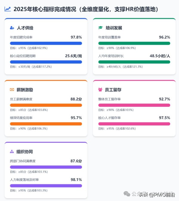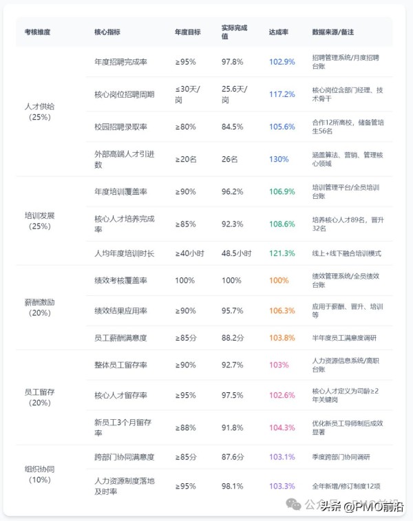 2025年,部门围绕“人才供给、培养发展、激励效能、员工留存、组织协同”五大维度设定15项核心指标,整体达成率106%,关键战略指标超额完成,有效保障了公司业务发展的人才需求。