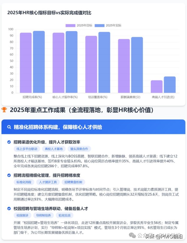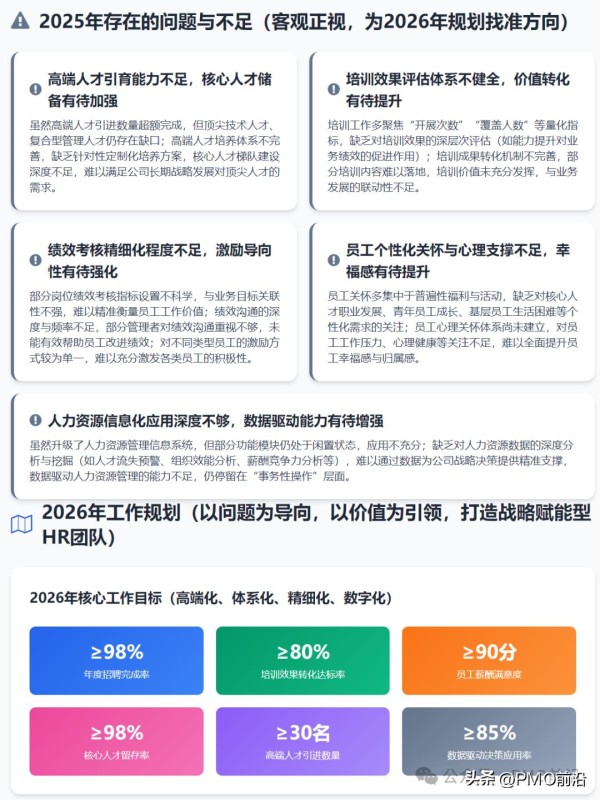 2025年,人力资源部在人才供给、培训赋能、薪酬绩效、员工关系、组织建设等方面取得了一定成效,但也存在高端人才引育不足、培训效果转化不佳等短板。