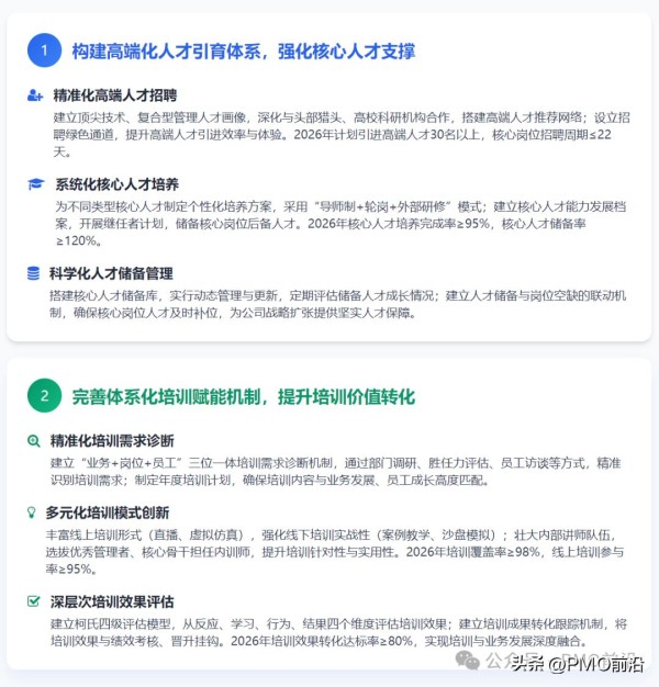 高端人才引育能力不足,核心人才储备有待加强虽然2025年高端人才引进数量超额完成,但在顶尖技术人才、复合型管理人才等领域仍存在缺口;高端人才培养体系不完善,缺乏针对性的培养方案,核心人才梯队建设深度不足,难以满足公司长期战略发展需求。培训效果评估体系不健全,价值转化有待提升
