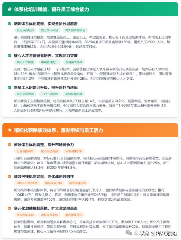 培训体系优化完善: 基于岗位胜任力模型,搭建覆盖新员工、基层员工、中层管理者、核心骨干的分层培训体系,明确各层级培训重点与目标;新增线上培训平台,上线课程200+门,实现员工随时随地学习,线上培训参与率达92%。
