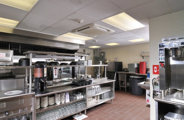 2. 厨房设备: 排风管道、排烟设备、持续油炸机、翻转锅、主动炒锅、刀板杀菌柜、米饭出产线、餐具浸泡槽、操作台、风力烤线、全能点烤箱、洗涤槽、洗涤盘、保管箱、贮存柜、寄存架、餐车、炊具五金架、杆、钩、餐具五金架、杆、钩、调料盒、调料箱、调料架、炊具架等。