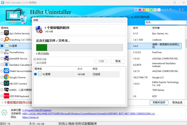 1. HiBit Uninstaller(便携版) 下载后无需安装,直接双击启动程序,主界面会列出电脑中所有已安装软件,包含名称、大小、安装日期等信息,支持搜索快速定位目标软件;单软件卸载:选中软件后点击 “卸载所选项”,常规软件会自动清理,顽固软件可右键选择 “强制删除”;批量卸载则勾选多个软件,点击批量处理按钮即可;卸载完成后,软件会自动触发深度扫描,勾选检测到的残留文件和注册表项,点击 “清理” 即可彻底删除,还可通过左侧菜单栏使用垃圾清理、进程管理等附加工具。