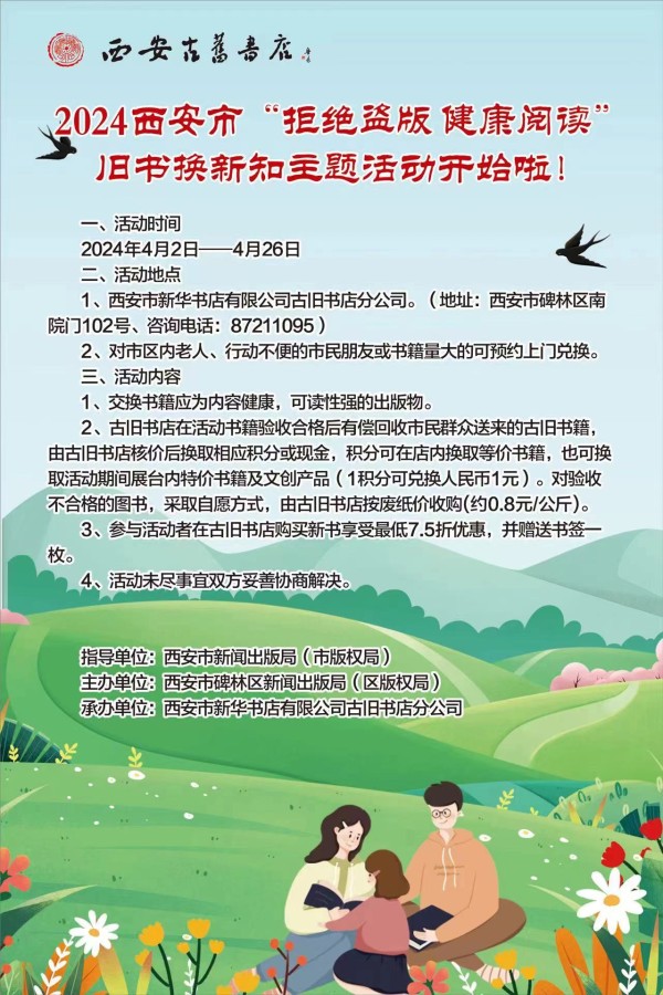 本次活动由西安市新闻出版局(市版权局)指导,西安市碑林区新闻出版局(区版权局)主办,西安市新华书店有限公司古旧书店分公司承办,旨在深入推进全民阅读,营造浓厚书香氛围,让手中闲置的图书“活”起来,助力书香西安建设。4月2日至26日,将在西安市新华书店有限公司古旧书店分公司一楼设置活动专区,开展旧书兑换、全民阅读、知识讲座等活动。