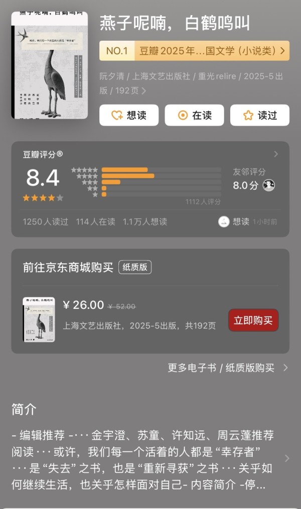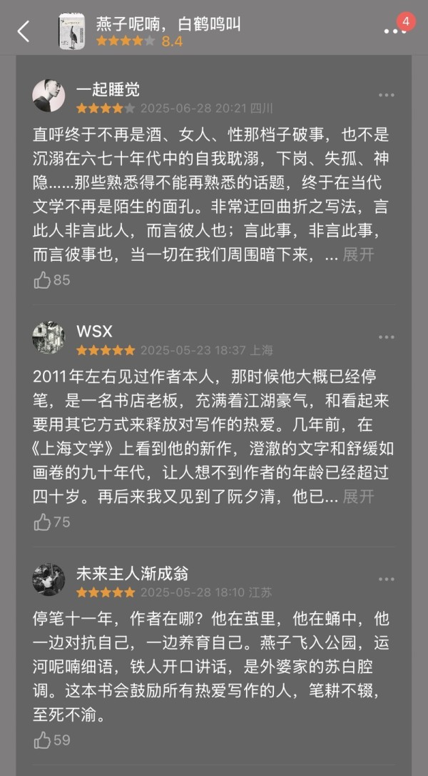豆瓣上,上千名读者为《燕子呢喃,白鹤鸣叫》打出8.4的高分,500多名读者写下短评,使该书成为豆瓣读书榜单2025年度中国文学(小说类)top1。作品入选搜狐文化年度榜单,入围新世相出版奖,头部播客“文化有限”解读该书的节目吸引7.7万听友收听。从这位70后的小说中,读者读出了那个失意迷茫的“老己”,也触摸到作品微温的内核。