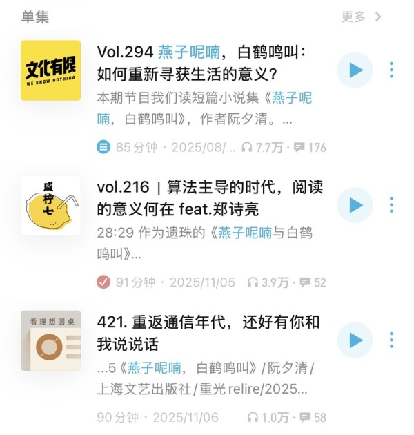 “从前,引领阅读的是报刊荐读、名家荐书,如今,权威受到质疑,阅读行为变得去中心化,阅读生态更加丰富和活跃。”当阮夕清的朋友把播客链接转给他时,他才知道今天的读者不仅玩转豆瓣、知乎、小红书,也沉浸在播客这样的新兴阅读媒介里。“文化有限”的三位主播大壹、星光和超哥,都并非专业读者,却将“有限”的解读作为踏入文本的蹊径,从而塑造出全民阅读的新鲜风貌。