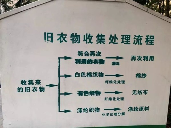 在北雀路恒兴名园小区,记者看到一家叫益民环保公益的机构放置的旧衣服回收箱,箱体上面印刷着“垃圾分类 柳州更美”的字样,箱体侧面也注明了旧衣服处理流程,流程上写明了回收旧衣服一部分除了消毒后再次利用外,其他的则是纤维化处理或者化学处理分解,制成棉纱、无纺布、涤纶原料等。没有标注是用于捐给贫困地区的人群。