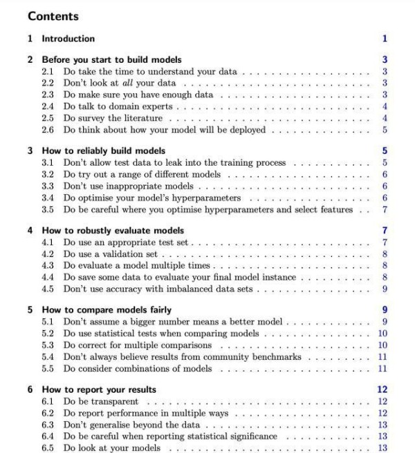 指南共涵盖了机器学习过程的五大方面:建模前如何准备,如何建出可靠的模型,如何稳健地评估模型,如何公平地比较模型以及如何报告结果。