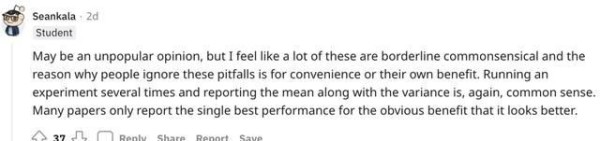 一位已经从业的机器学习研究员称赞该论文很有价值,因为文中提到的所有错误他在博士学习和工作期间中都遇到很多次。他准备让后面所有新入职的工程师都好好看看。