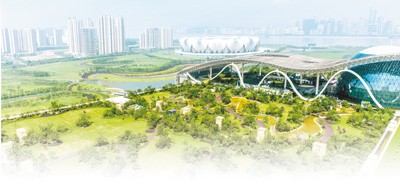 鸟瞰杭州国际博览中心屋顶花园。
