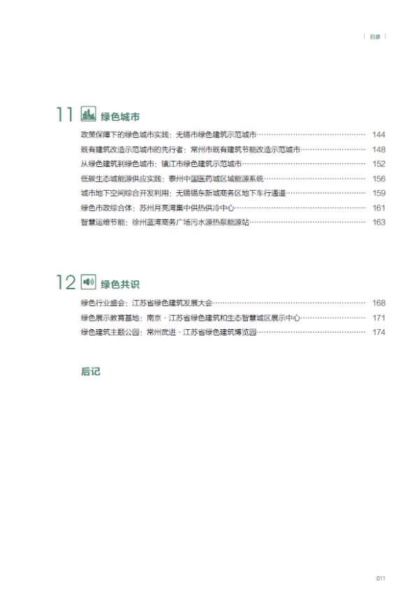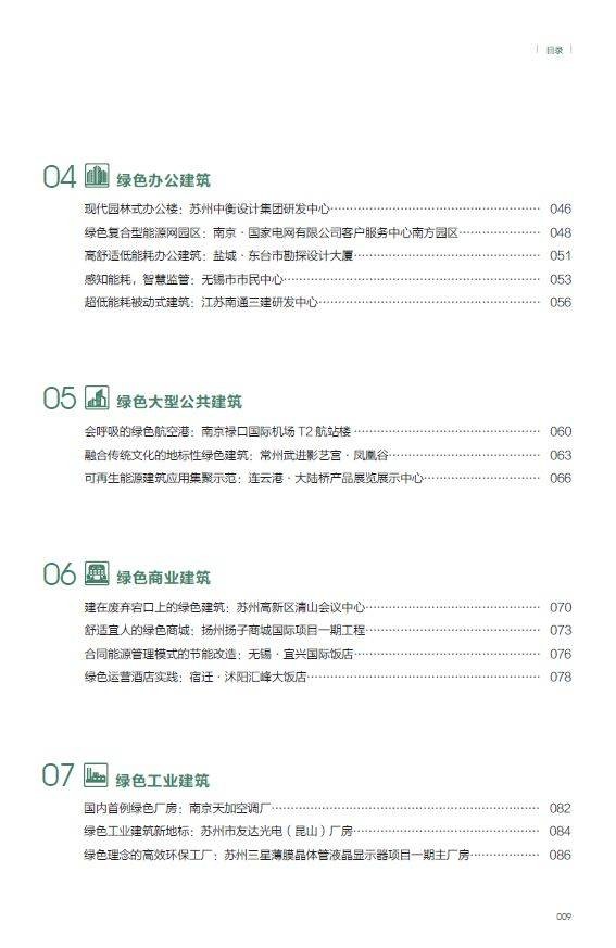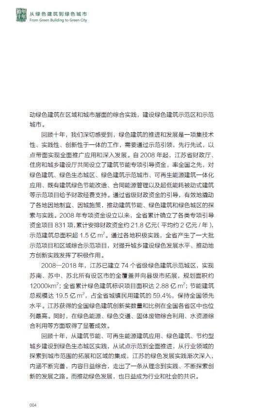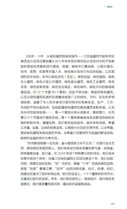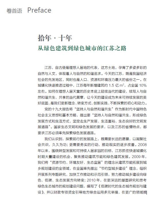 图书信息 书名:《拾年·十年 从绿色建筑到绿色城市——江苏省建筑节能专项引导资金示范项目案例集》 ISBN:978-7-112-23538-4 定价:98.00 出版年月:2019年7月 部分案例 1 江苏省绿色建筑博览园是国内首个绿色建筑主题公园,也是国内第一个以绿建筑为主题且具有较高感知性、体验性、推广性的博览园。博览园利用在高压走廊下的闲置空间,围绕绿色生态建设的先进理念、技术和重点产品,在园区开展集成应用,通过绿色园区、海绵园区的建设,使废弃地重获生机。博览园园区建设运营机制灵活,政、产、学、研、用等多机构协同推进,建成了 5 个主题园区和三个绿色建筑组团。 2 无锡太湖新城是国家首批绿色生态城区,通过立法出台了全国第一部地方性生态城条例,以法律实行严格的规划控制、建设管理和运行实施,在资源能源利用、建筑节能、公交优先和慢行系统建设方面作出创新性的规定,体现了生态城建设的特色。通过国际合作,在规划设计、技术应用、生态建设、城市管理等方面,借鉴国内外先进生态城市建设理念和成功经验,按照“七个可持续”标准,高标准建设一流领先的中瑞低碳生态城。同时,太湖新城在 规划引领、绿色建筑高标准规模化发展、节约型城乡建设等方面成效显著,规划建设水平在 全国处于领先地位,构建了一套宜居宜业、产城融合的创新城市基本框架。 3 南京河西新城绿色生态城区(以下简称“河西新城”)作为疏散南京老城功能、拓展城市空间的承载区,承担着老城区人口疏散的重要责任。河西新城在规划建设过程中始终坚持以人为本,紧紧围绕“绿色、人文、紧凑、集约”的理念,通过高标准的规划设计,全面统筹城区地上地下空间资源、生态环境能源资源、生产生活配套资源等,逐步建成了人居环境良好、城市紧凑集约、建筑绿色生态、设施配套齐全的绿色新城。通过高质量的人居环境建设,吸引高端人才、科技产业进驻,初步形成了疏散城市功能的“反磁力”中心,带动了区域人才发展和产业创新,提升了南京城市首位度。经阶段性评估研究,河西新城现有人口约 46 万,建成区职住平衡指数达到 97.8%。 4 苏州高新区清山会议中心坐落于高新区科技城青山西侧,原址是一座废弃的采石宕口,地形东低西高。酒店结合宕口整治,依据宕口原有场地规划建设,由东至西,沿山体逐渐拾级而上,尽量不改变并合理利用宕口四周原有的植被、水系。景观设计中通过室外庭院、屋顶花园、绿色中庭等布置,使整个建筑掩映在青山的山水风光之中,自然和谐。建筑群合理组织,引导雨季山洪排入酒店东侧彩石湖,消除山体滑坡等地质灾害,有效提高了青山的生态景观和土地使用价值。 精彩内文