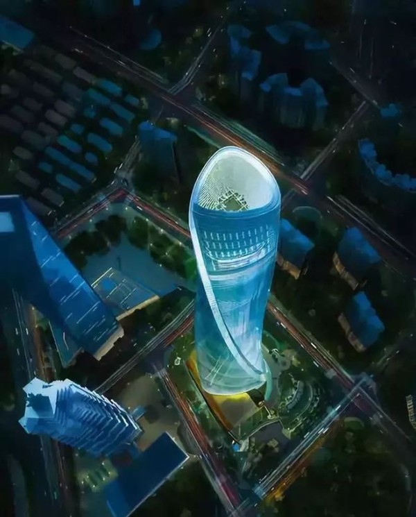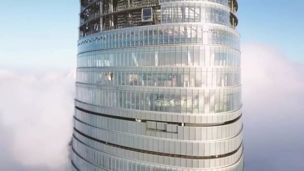 图中我们可以看到,大楼外部的造型呈旋转式,不对称的外部对立面可降低大厦24%的风荷载(空气流动对工程结构所产生的压力)。呈漏斗状的螺旋顶端还可将雨水收集,导入水箱,供大楼使用。