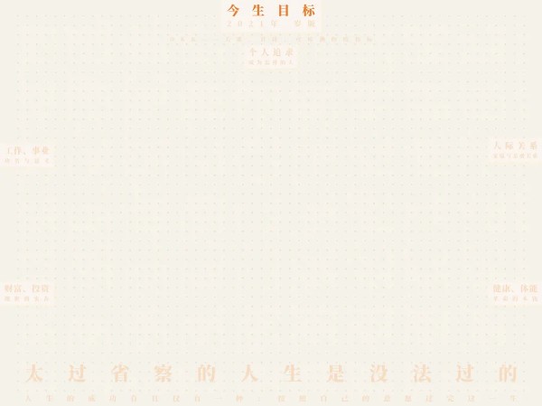 因为通常我们在以人生的尺度来思考的时候,就会把目标定得太高大上,或者无从下手,这里就是尽量消减这种无力感,而且没有划分具体的区域,每一个方向都可以自由书写。