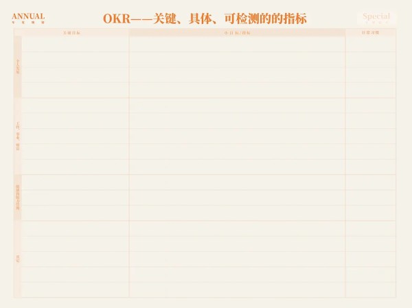 再然后是年度规划,但并不是全年的规划,而是重要目标规划。这里提倡利用类似OKR的形式填写关键指标。