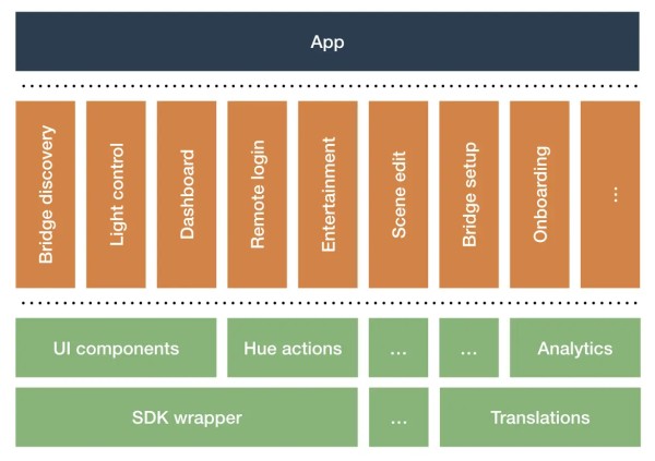 请注意,由于飞利浦Hue的大型遗留代码库,它尚未完全迁移到此架构:目前,有8个功能模块和14个库。使用功能切换重写功能并逐步将其逐步推出。