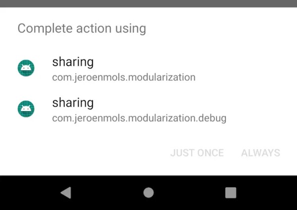 最后,依赖隐式Intents可能会导致选择器对话框弹出。虽然不太可能与第三方应用程序发生冲突,但很容易发生不同的构建风格。