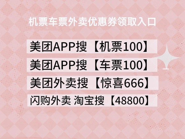 划重点!火车票飞机票优惠券领取方法美团APP搜索【机票100】【车票100】,领100元红包优惠券,最终实际付款全网最低,切记对比付款价!全国通用券!