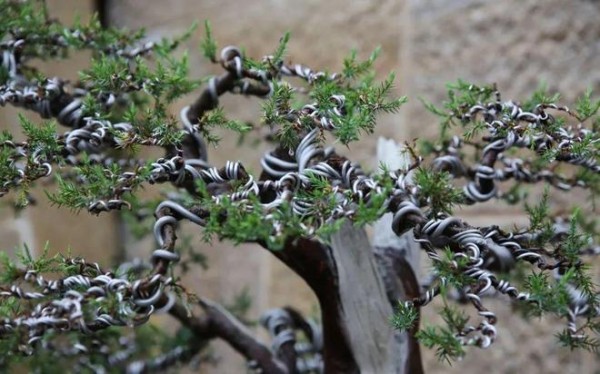 如同为了满足人类的观赏需求,被铁丝束缚而不得不扭曲生长的盆栽。