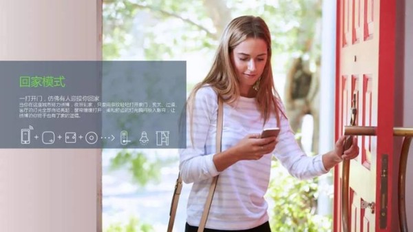 出门一键离家,所有灯光和家电自动关闭,安防系统自动开启;回家前动动手指,家里的空调开启,进门即可享受舒适生活;晚上回家,开门灯即亮;早晨唤醒你的不一定非要是讨厌的闹钟,也可以是温柔的阳光与音乐。