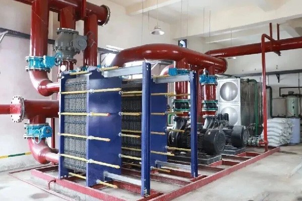图为:潞城区翟店街道北舍村新建成的集中供热换热站内崭新的供热设备平稳运行