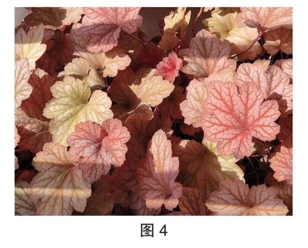 这里的用词是“耐寒”,它和上文中提到的天竺葵、仙客来、角堇等喜冷凉植物不同,对于低温有更强的耐受力。10~30 ℃,是矾根适宜的生长温度,30 ℃以上停止生长,需要北向遮阴养护。理论值上能耐受极端-20~30 ℃的低温,耐雪后寒,春暖后正常发芽。东北皑皑白雪覆盖下,春暖后依然能表现出勃勃生机,适合家庭的小型园艺品种,矾根是首选。冷与不冷,矾根就在那里,不悲不喜(图4)。