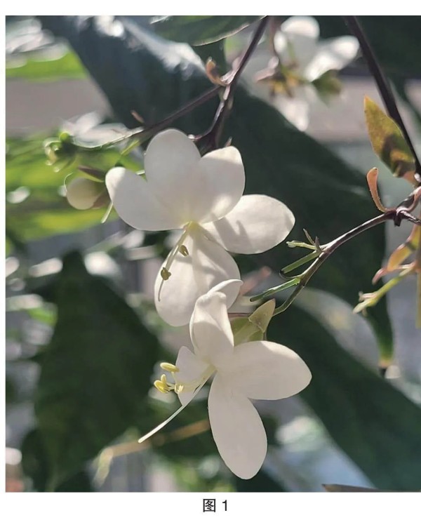 花苞乳白,形似圆滚滚的小珍珠,而花朵一旦打开,又如只只蝴蝶翩跹起舞。只待清风几许,花枝摇曳,一帘幽梦,尽在其中(图1)。