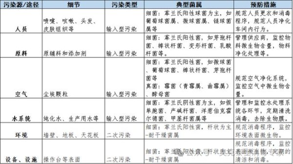 微生物污染来源多样,包括人员、原料、空气、水系统、环境、设备设施等。不同来源的微生物污染类型与典型菌属存在差异,需采取针对性的预防措施。