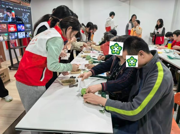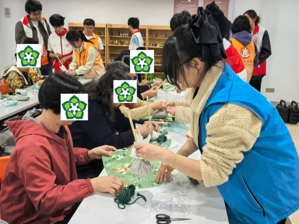 社工与志愿者指导参与者制作艾草锤