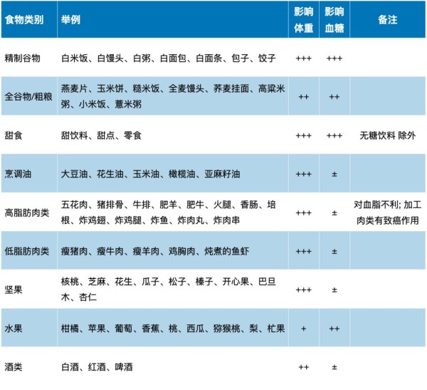 表 2-1 对体重/血糖影响较大的食物(±表示有一点点或没有影响)