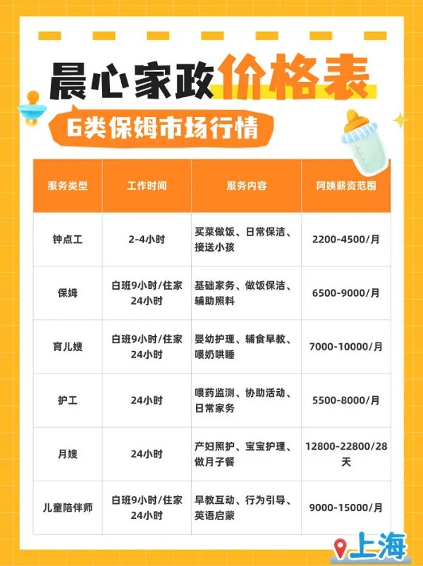 姐妹们! 刚刚整理了上海家政市场最新价格表,保姆、育儿嫂、月嫂、钟点工…各类家政服务薪资全解析!