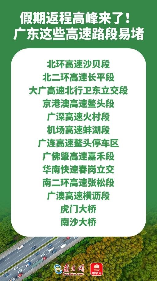 本次假期返程高峰预计从10月7日14时开始,并于10月8日下午迎来返程最高峰。广州交警预计,返程易拥堵缓行的高速包括以下路段: