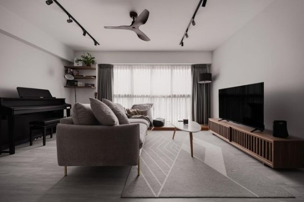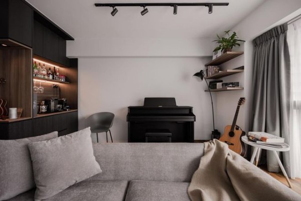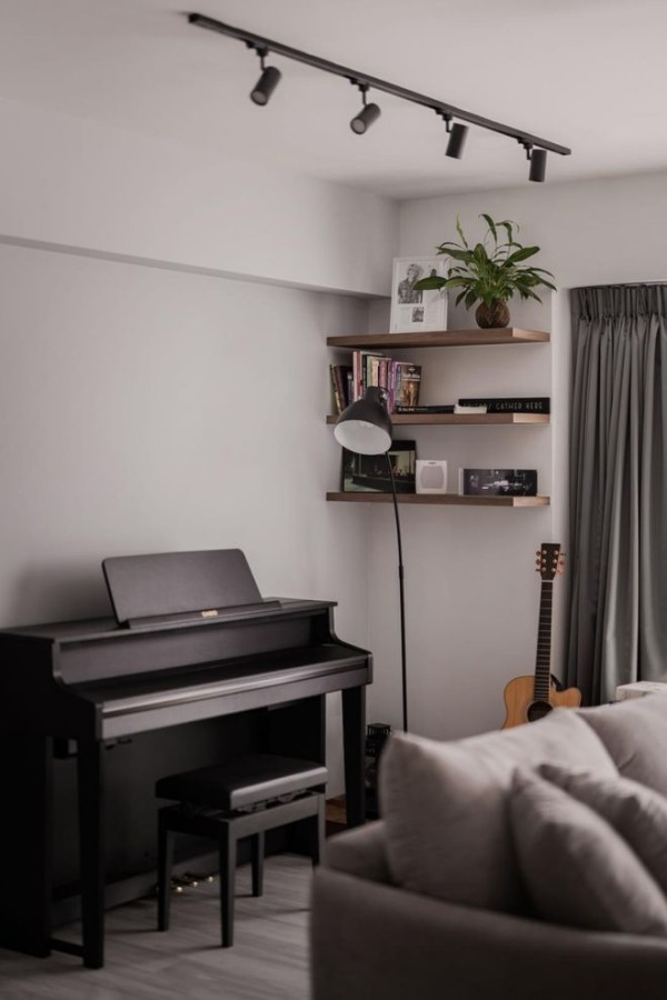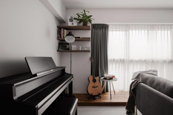 沙发不靠墙,背后的空间放置上钢琴。以后教孩子弹钢琴,家人也能坐在沙发上陪伴。墙角的空间安装几排隔板做书架。