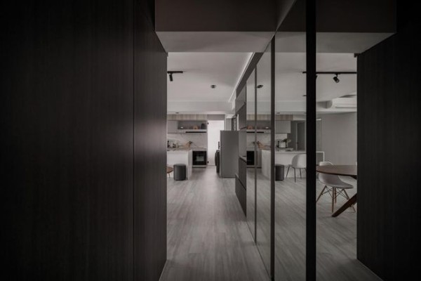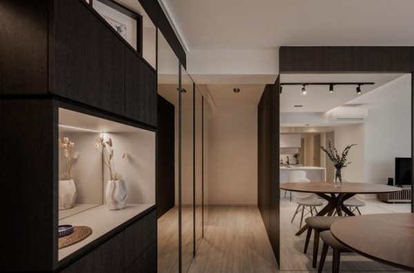 他家从入户门进来是一个过道,为了让采光变得更好,空间显得更大,于是在一侧全部安装上镜面,出门前可以整理衣服,又放大了空间。