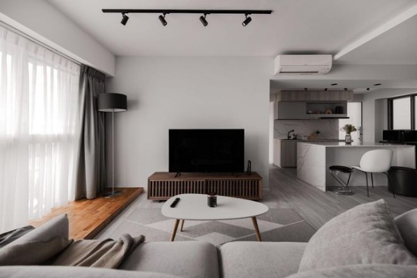 沙发、茶几和电视,和别人家的装修差不多。因为男主人比较喜欢简洁清爽的风格,所以只刷了大白墙,黑、白、灰为主色调,搭配木制家具使用。