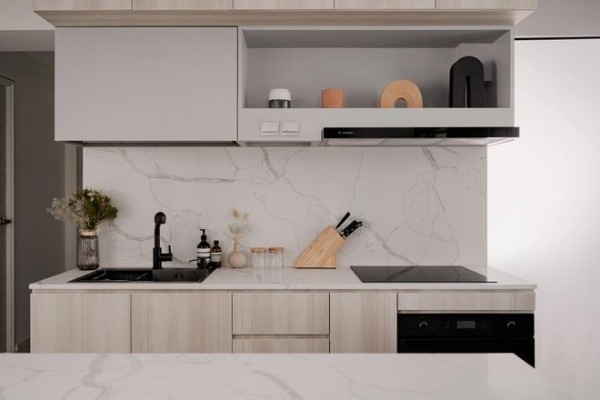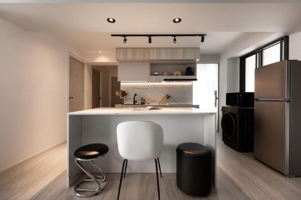 利用过道之间的墙面设计厨房,吊柜下安装灯带,避免下厨时磕碰到头。因为操作台比较窄,另外增设了长形岛台,补充厨房的操作空间,同时也可以作为餐桌使用。一侧通往生活阳台的门选择了透光性好的玻璃门。