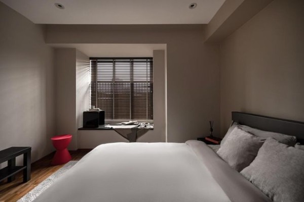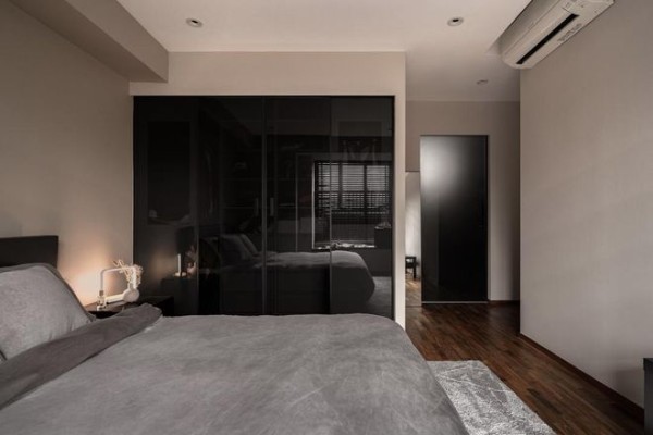 卧室保留了原本的飘窗,摆上小桌子和毛毯就是卧室的一块休闲空间。一侧衣柜嵌入式设计,为了节省空间的使用,安装了玻璃推拉门。