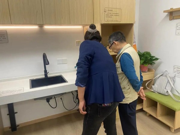 “老人能根据自己的身高和需求,调节厨台高度。”工作人员一边操作,一边解释,“如果家里有坐轮椅的老人,就能把厨台下降到适合他的高度,而且厨台下方是空的,轮椅可以停靠到厨台下方,方便坐轮椅的老人在厨台边洗碗洗菜。”
