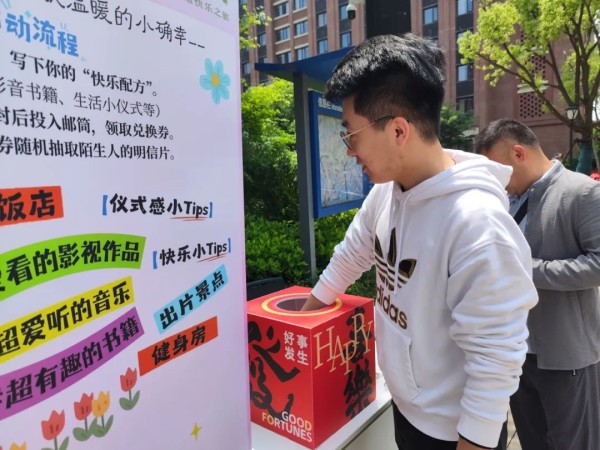 4月25日中午与傍晚,“快乐清单漂流”摊位如期开放。一张张被认真写下的明信片,终于迎来了它的读者。同学们从漂流盲盒中抽取出来自陌生人的快乐清单。每一次打开,都是一场陌生人之间的小小遇见。