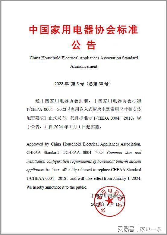 9月11日,中国家用电器协会发布公告:经过中国家用电器协会批准,协会标准T/CHEAA 0004—2023《家用嵌入式厨房电器常用尺寸和安装配置要求》正式发布,代替标准号T/CHEAA 0004—2018,并自2024年1月1日起实施。