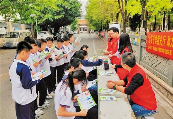志愿者发放宣传册。本报讯 为进一步加快垃圾分类工作,提高居民垃圾分类意识,近日,由潮南区城管局、团潮南区委主办,峡山街道办事处、峡山社区承办的“垃圾分类我先行 助力百千万工程”主题宣传活动在峡山绿园举行。