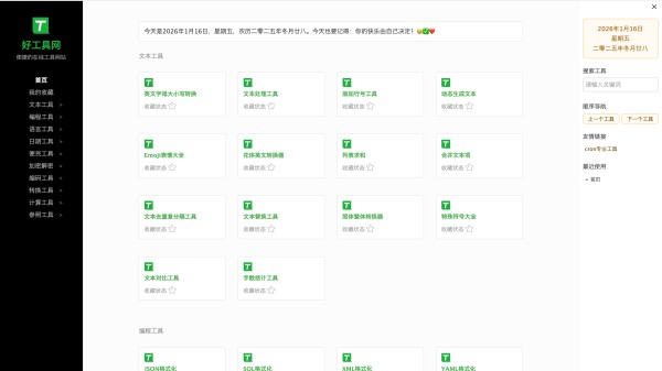 好工具网是一个 集成海量实用工具的一站式在线平台,覆盖从文本处理、日期计算、编码转换到单位换算、加密解密等各类常用工具类别,让你的工作和生活变得更轻松、高效。