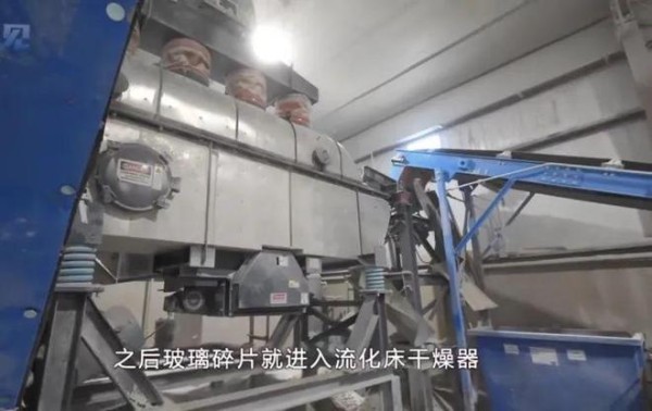 之后玻璃碎片就进入流化床干燥器被加热到87摄氏度,玻璃碎片上残留的标签纸的胶就开始融化和松动,然后洗涤设备就可以去除掉玻璃上的标签纸,一切都是自动化完成。