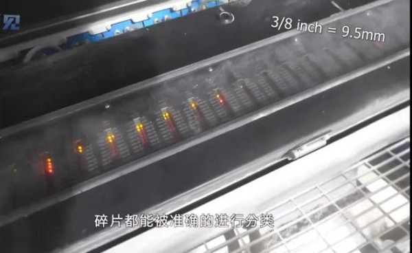 不过此时各种不同颜色的玻璃碎片还混杂在一起,就需要使用光学分拣机把不同颜色的玻璃碎片分开,即使最小9.5毫米的玻璃碎片都能被准确地进行分类。