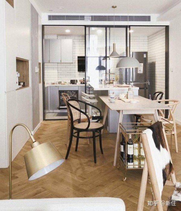 这种户型的厨房,建议用玻璃门做隔断,视觉上通透,可开可合。做饭的时候关闭,阻止油烟飘出,平时打开即可,在厨房准备食材,也能和客厅的家人交流。