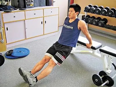 家庭训练动作9:平板臂屈伸 平板臂屈伸是锻炼肱三头肌的高效训练动作。进行平板臂屈伸非常简单,你只需要找一个平板,或在床边进行即