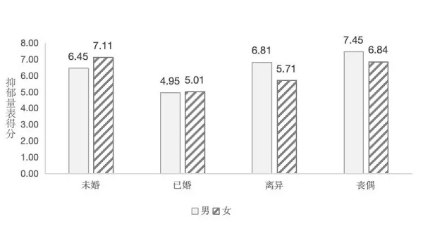 除以往《心理健康蓝皮书》关注的总体社会支持水平以外,对心理健康的影响尤为显著。已婚人群抑郁水平最低,未婚、离异或丧偶群体的风险逐级上升。