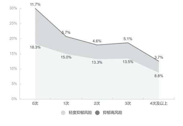 健康生活方式则是重要的保护性因素。随着的提高,无论是轻度抑郁风险,还是抑郁高风险的比例都在逐级下降。每周运动≥4次的群体抑郁高风险比例降低为不运动组的三分之一。
