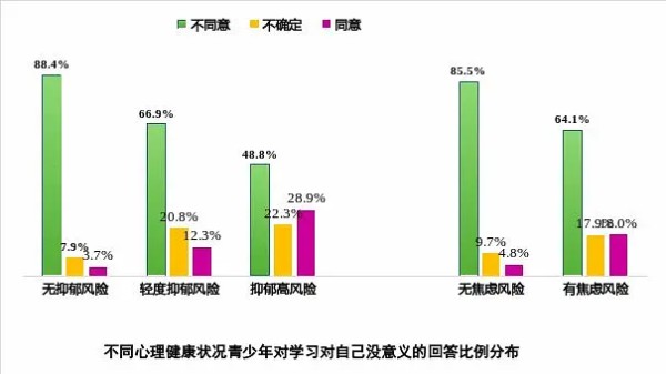 学习的内部动机是指个体因自身内在的兴趣和需要,而非外在奖励或压力而进行自主学习的驱动力。内部动机往往与较高的持久性、创造性和学习成就有关。内部动机高的个体更看重对学习内容本身的掌握。本次调查显示,无抑郁风险或无焦虑风险的青少年中,仅不到5%同意学习对自己没有意义,而在有轻度抑郁风险的青少年中,同意这一说法的比例升高至12.3%,抑郁高风险中更是达到了28.9%。