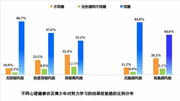 调查显示,无抑郁风险和无焦虑风险的青少年中,近九成相信自己能掌握学习内容,而轻度抑郁风险和抑郁高风险的青少年中这一比例分别下降至67.4%和50.3%,有焦虑风险的青少年中为62.8%。值得关注的是,,无抑郁风险和无焦虑风险的青少年中超过八成同意“只要我努力,就能学会各种学习内容”,而在抑郁高风险青少年中这一比例下降到55.2%。