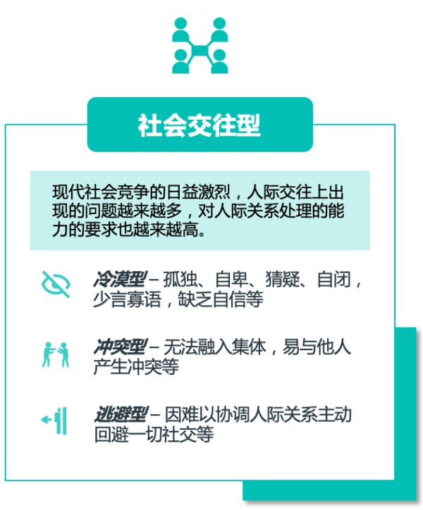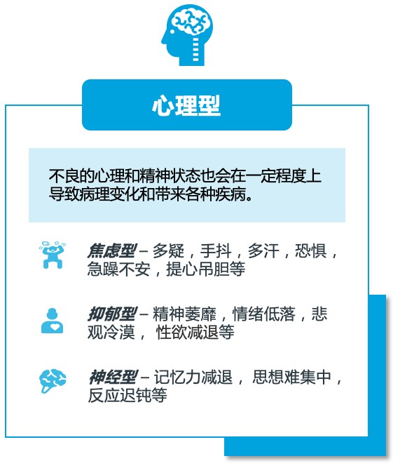 现阶段社会极大地拓宽了健康的观念,从过去的仅关注躯体的健康,到现在包括心理、社会适应、道德品质,相互依存、有机结合。目前,亚健康主要有三种表现形式:躯体型、心理型和社会交往型。