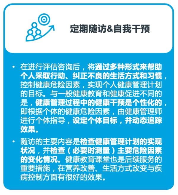 健康管理是对个人或人群的健康危险因素进行全面管理的过程。可以了解您的身体年龄,判断患病倾向,由医生向您提供健康生活处方及行动计划。长期(终生)跟踪您的健康,最大限度减少疾病的发生。同时,及时指导就医,降低个人医疗花费,提高您的保健效率,最终达到提高个人生命质量的目的。